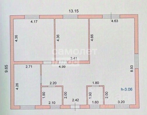 В доме три жилых комнаты.Гостиная с действующим камином:21,2 кв. м., спальня 1:11,8 кв. м., спальня 2:11,3 кв. м.