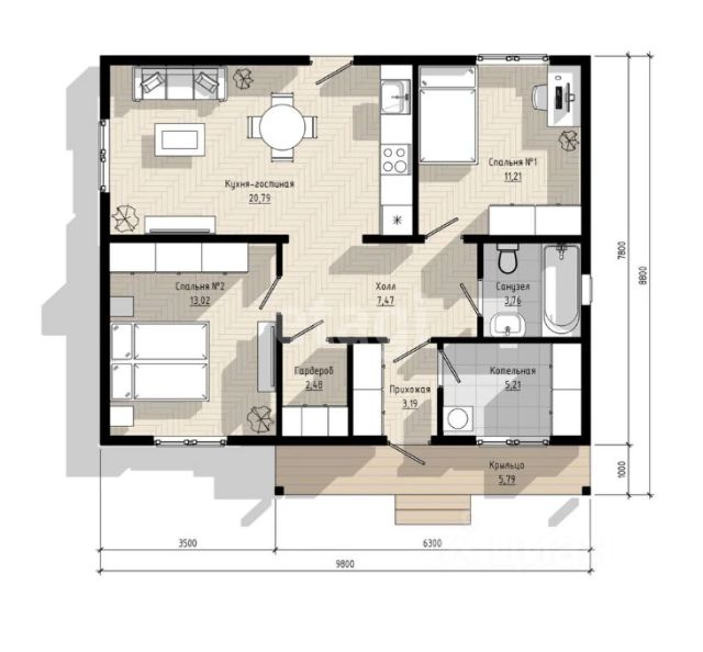О Доме: Каркакасник, теплый на винтовых сваях, кухня-гостиная, две спальни, котельная.