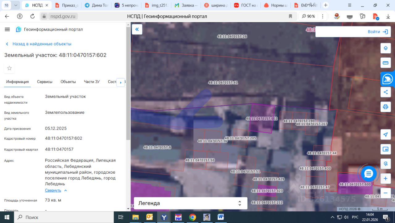 Земельный участок с кадастровым номером 48:11:0470157:602 площадь 73 по адресу Российская Федерация, Липецкая область, Лебедянский муниципальный район, городское поселение город Лебедянь, город Лебедянь