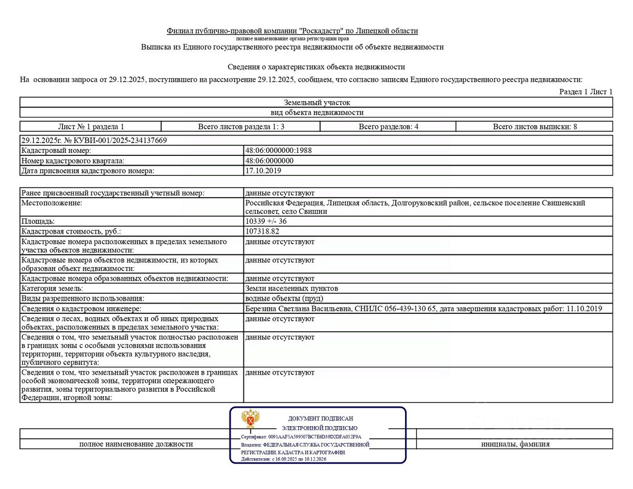 Местоположение (адрес): Липецкая область, р-н Долгоруковский, с/п Свишенский сельсовет, село Свишни Площадь: 10339 +/- 36 кв.м. Обременения: нет. Кадастровый номер: 48:06:0000000:1988 Категория земель: земли населенных пунктов Разрешенное использование: водные объекты (пруд) Срок аренды земельного участка: 10 (десять) лет.