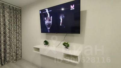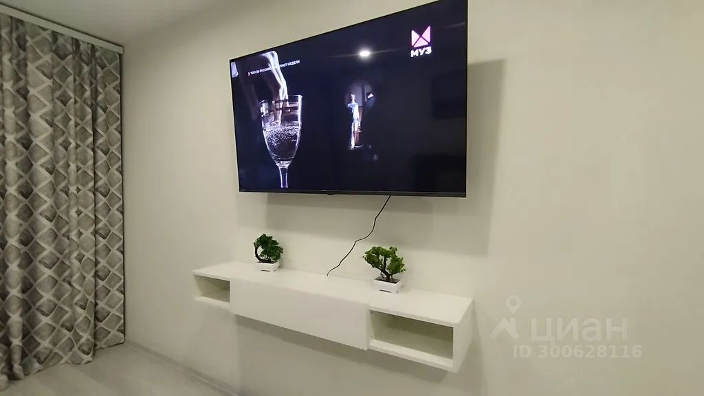 На стене телевизор диагональю 55" под ним подвесная тумба, более двухсот каналов Smart TV, Wi-Fi и кондиционер.