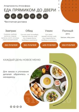 • Питание под заказ (за 12 часов): завтрак, обед, ужин