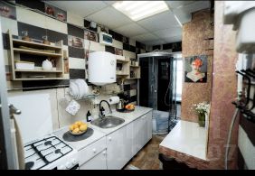 Мини-кухня с газовой плитой, микроволновкой, холодильником и всей необходимой посудой.