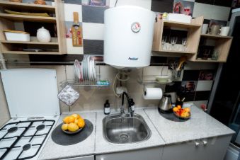 Практичный санузел душевая кабина, бойлер для горячей воды.