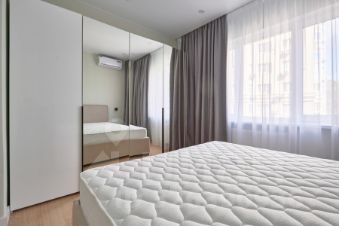 Квартира с балконом в кухне-гостиной. Уютная спальня обустроена кроватью с ортопедическим матрасом и плотными шторами блэкаут для глубокого сна. Совмещенный санузел оборудован ванной, стиральной машиной и зеркалом с подсветкой.