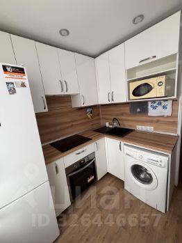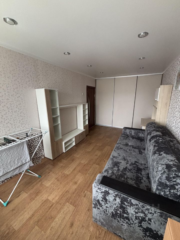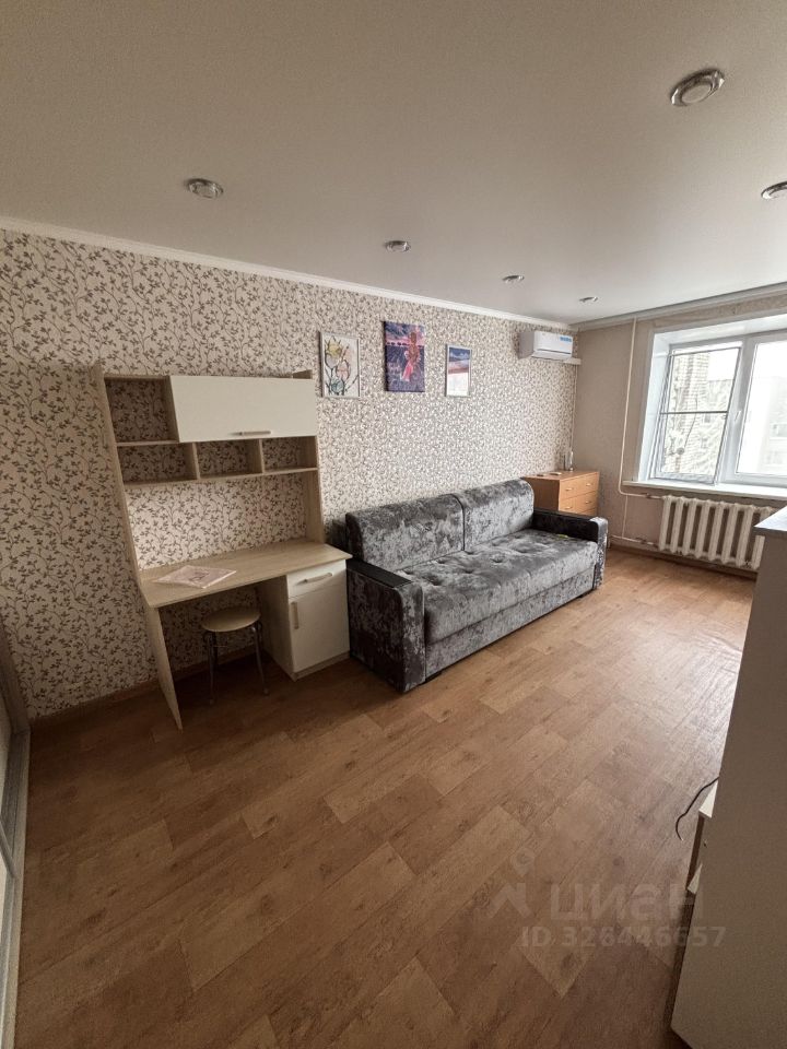 Квартира полностью готова для проживания: есть диван, кухонный гарнитур, кондиционер, встроенный шкаф в комнате и шкаф в коридоре, письменный стол, стиральная машинка, холодильник.