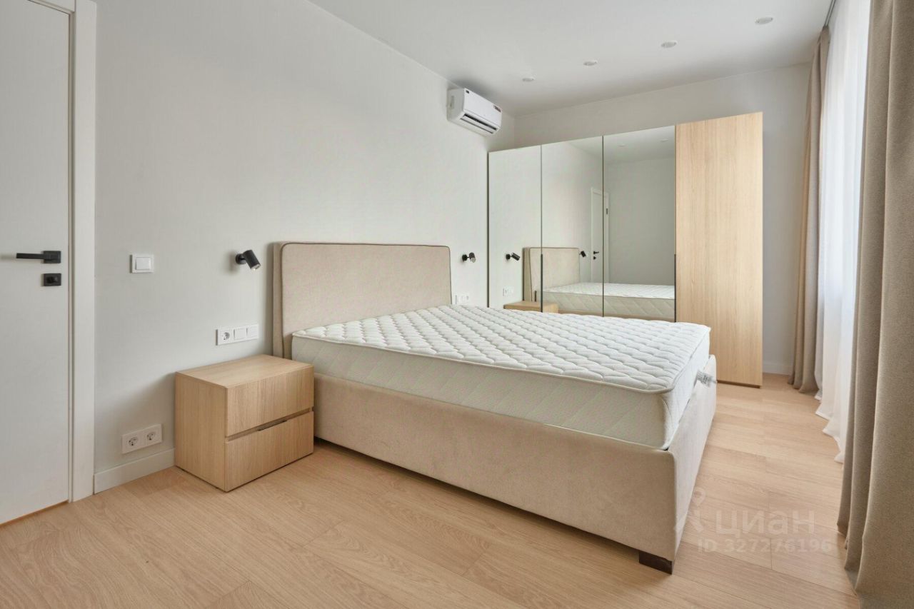 Квартира с балконом в кухне-гостиной. Уютная спальня обустроена кроватью с ортопедическим матрасом и плотными шторами блэкаут для глубокого сна. Совмещенный санузел оборудован ванной, стиральной машиной и зеркалом с подсветкой.