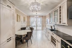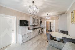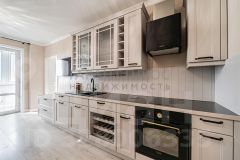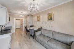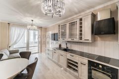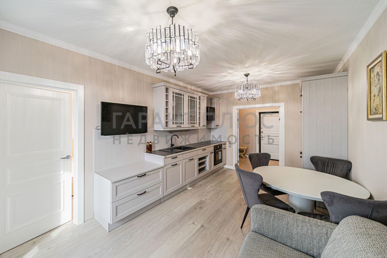 Кухня площадью 12 м² оснащена современной мебелью и бытовыми приборами, включая холодильник и стиральную машину. Две смежные комнаты с двумя спальными местами идеально подходят для проживания 1-2 человек. Имеется лоджия и совмещённый санузел с качественной сантехникой.