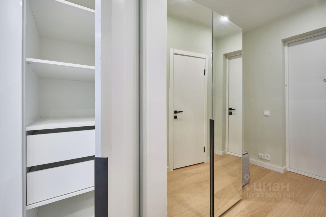 Студия с просторным балконом, выделенной рабочей зоной и продуманным хранением. Совмещённый санузел оснащён удобной душевой кабиной, стиральной машиной и зеркалом с подсветкой.
