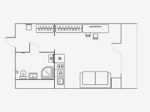 Студия с просторным балконом, выделенной рабочей зоной и продуманным хранением. Совмещённый санузел оснащён удобной душевой кабиной, стиральной машиной и зеркалом с подсветкой.