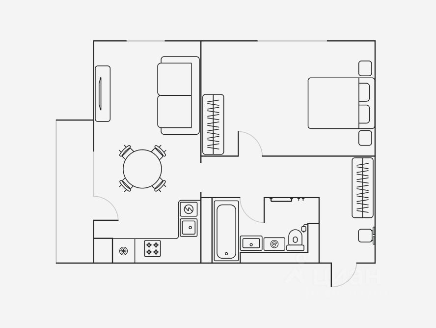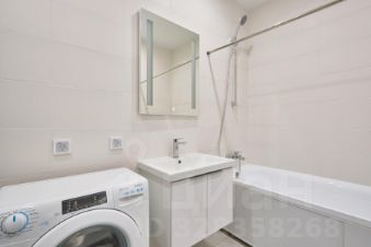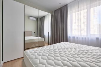 Квартира с балконом в кухне-гостиной. Уютная спальня обустроена кроватью с ортопедическим матрасом и плотными шторами блэкаут для глубокого сна. Совмещенный санузел оборудован ванной, стиральной машиной и зеркалом с подсветкой.