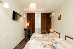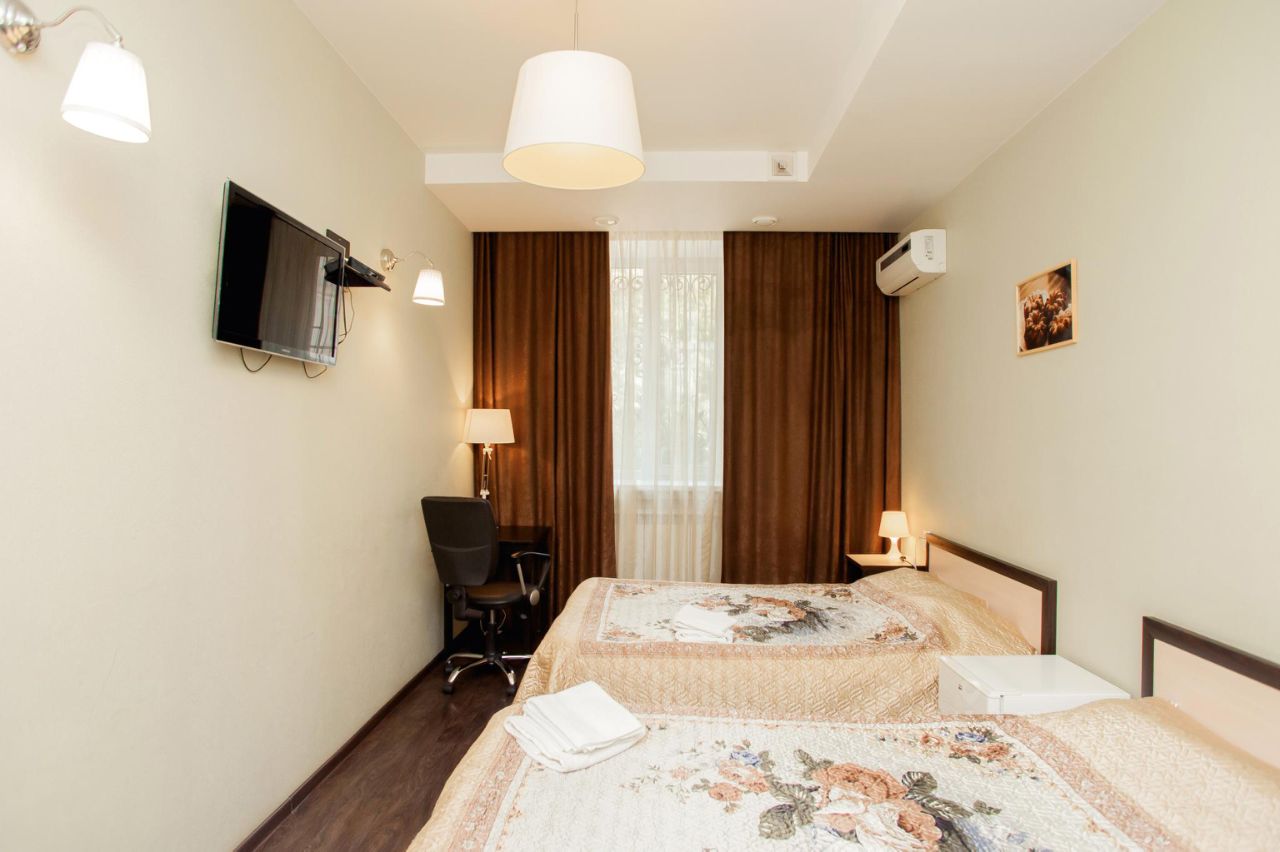 В номере две полутораспальные кровати, рабочий стол, кресло, шкаф, телевизор, кондиционер, чайник, разовые гигиенические принадлежности, тапочки.