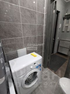 Ванная комната и туалет совмещенные. В ванной установлена тумба под раковиной, стиральная машина, зеркало.