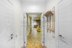 Закрытая территория двора, свой выход на внутренний двор. Планировка: кухня-гостиная, две спальни, два сан узла, гардеробная комната и большая ниша под лестницей.