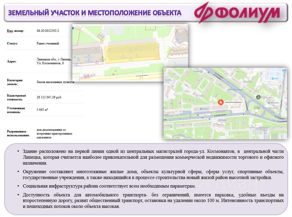 •Здание расположено на первой линии одной из центральных магистралей города-ул. Космонавтов, в центральной части Липецка, которая считается наиболее привлекательной для размещения коммерческой недвижимости торгового и офисного назначения.
