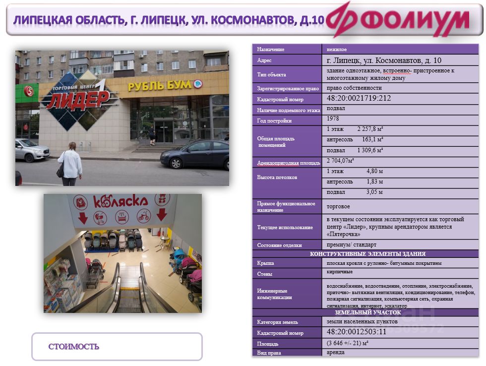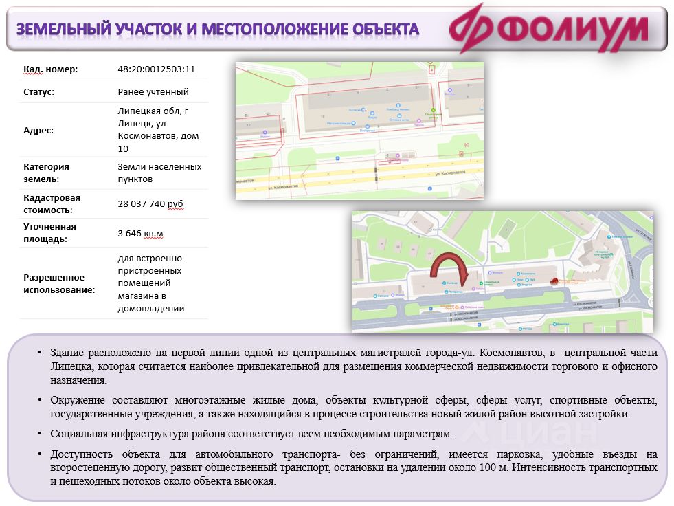 • Здание расположено на первой линии одной из центральных магистралей города-ул. Космонавтов, в центральной части Липецка, которая считается наиболее привлекательной для размещения коммерческой недвижимости торгового и офисного назначения.