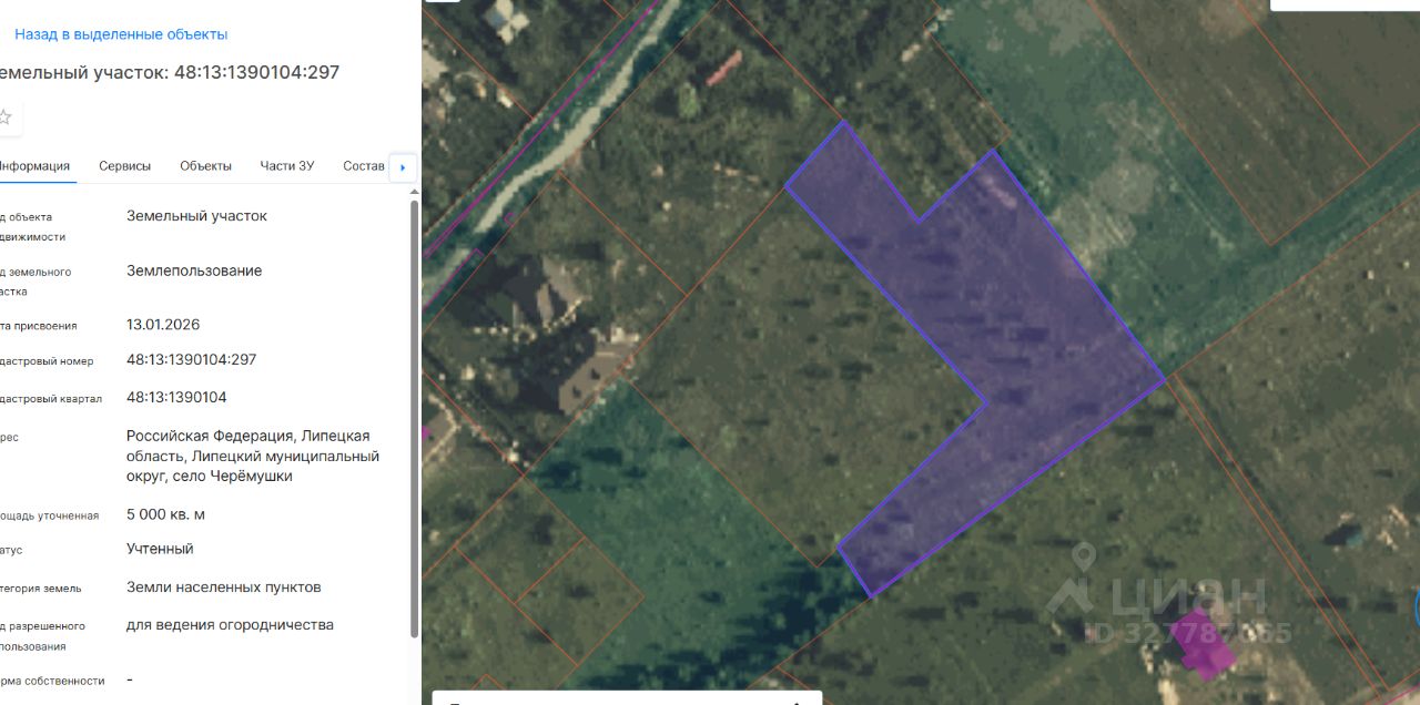 Земельный участок с кадастровым номером 48:13:1390104:297, площадью 5000 кв.м, с категорией: земли населенных пунктов, разрешенное использование: для ведения огородничества, по адресу: Российская Федерация, Липецкая область, Липецкий муниципальный округ, село Черёмушки