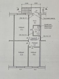 Общая площадь 60,9 кв.м. В помещении 3 изолированные кабинета: 17,1 кв.м., 17,0 кв.м., 10,2 кв.м. Есть санузел и помещение для хранения. Сделан косметический ремонт.