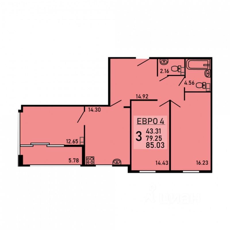 Трехкомнатная квартира 85.03 кв.м. от застройщика