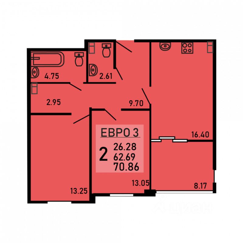 Двухкомнатная квартира 70.86 кв.м. от застройщика
