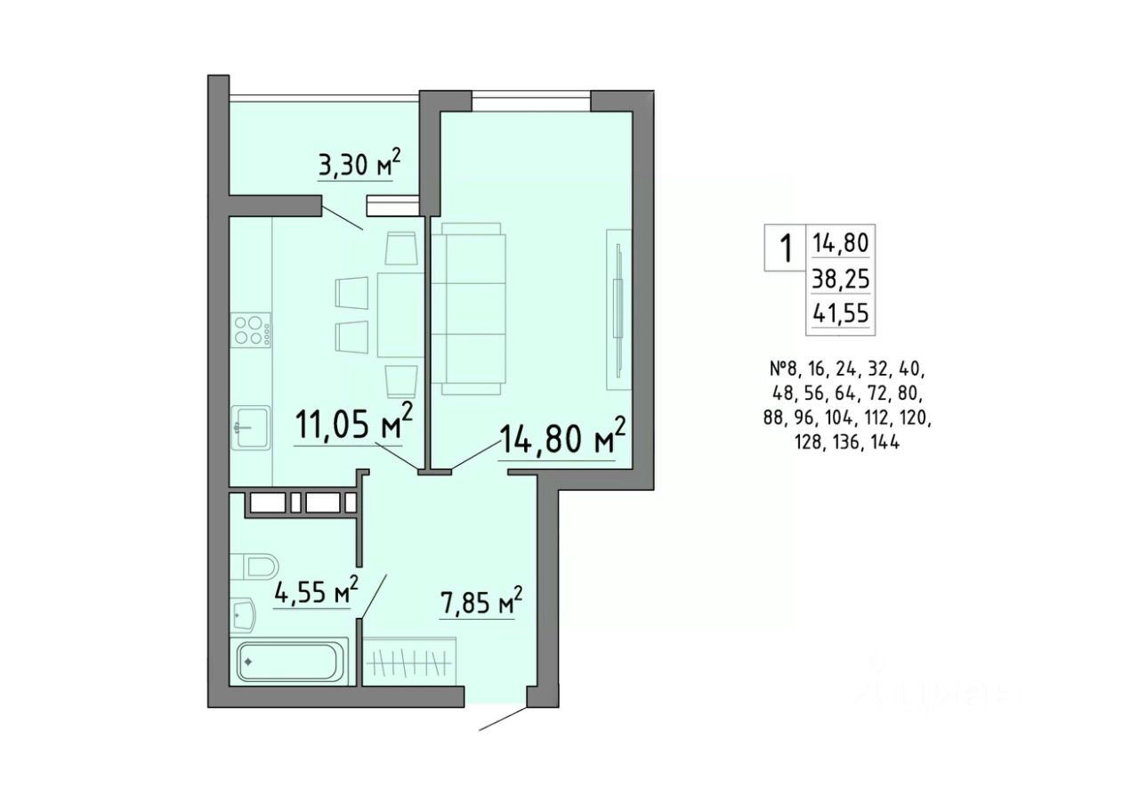 Продаётся 1-комнатная квартира в строящемся доме (Позиция 2), срок сдачи: IV-кв. 2026, общей площадью 41.55 кв.м., на 18 этаже. Новый жилой комплекс "Огурцы" от застройщика "Сбер-Капитал Строй" расположен по адресу Липецк, ул Агрономическая