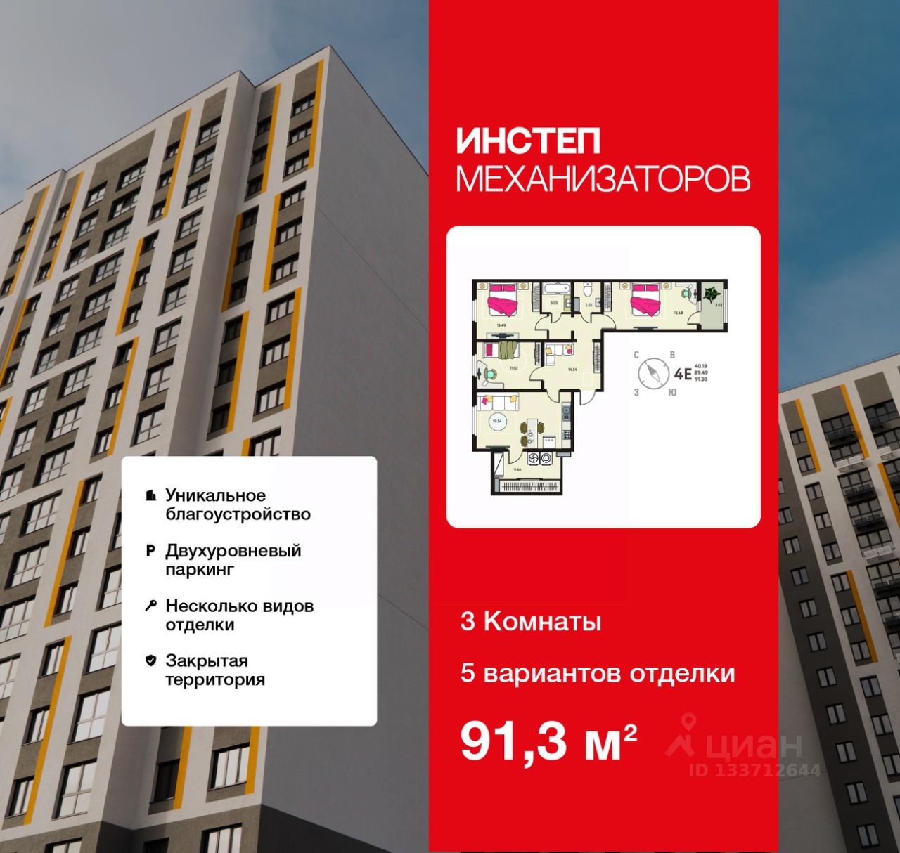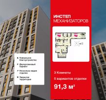 Трехкомнатная квартира в ЖК "ИНСТЕП.МЕХАНИЗАТОРОВ" на 18 этаже. Квартира без отделки, после оформления собственности можно делать ремонт. Общая площадь: 91.3 кв.м., жилая: 40.19 кв.м., площадь просторной кухни-столовой: 19.54 кв.м. Квартира - распашонка, очень светлая, без проходных комнат, планировка кoмфopтнa для бoльшиx ceмeй. В квартире один балкон, один раздельный санузел. Высота потолков 2.64 м.