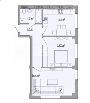 Планировка: изолированная. Жилые комнаты - 13,7 м² + 16,4 м², просторная прихожая - 7.3 м²