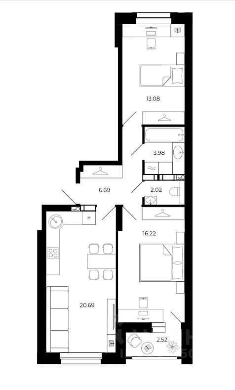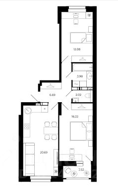 Кухня-гостиная 20.7 кв.м, спальни 13.8 + 16,22 кв.м.