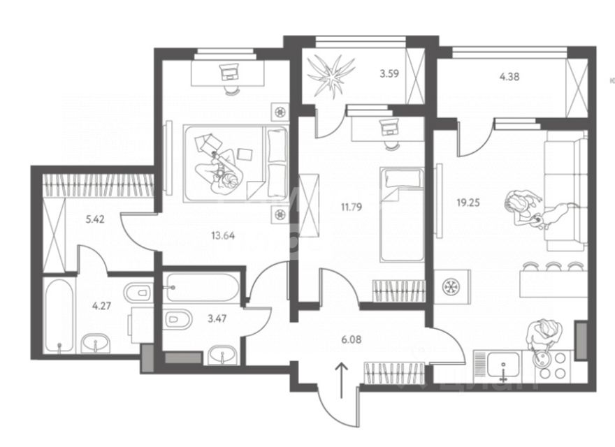 Комнаты 13.64 кв.м и 11.79 кв.м., просторная кухня-гостиная 19.25 кв.м.
