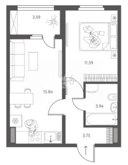 Общая площадь: 36,92 м²