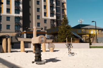 Концепция благоустройства сделана по специальному архитектурному проекту, с малыми архитектурными формами из металла с желтыми цветовыми акцентами, гармонирующими с фасадом домов. Для детской площадки предусмотрены игровые комплексы из натурального дерева в эко-стиле. Предусмотрено продуманное озеленение по дендроплану с автополивом и разноуровневое наружное освещение.