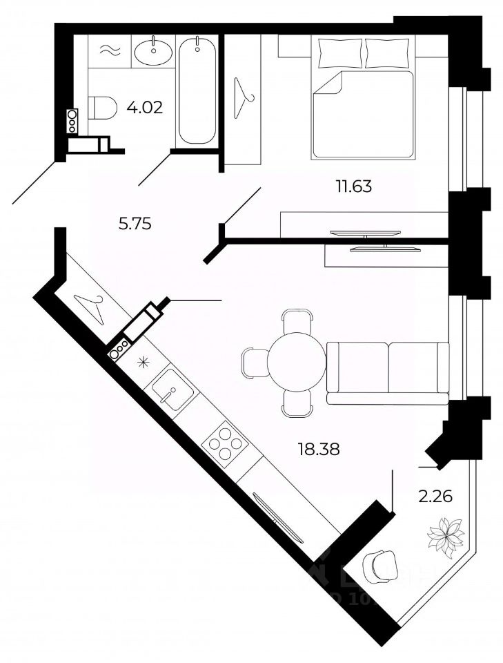 Арт. 103716628 Однокомнатная квартира площадью 41.55 кв. м. в современном жилом комплексе.