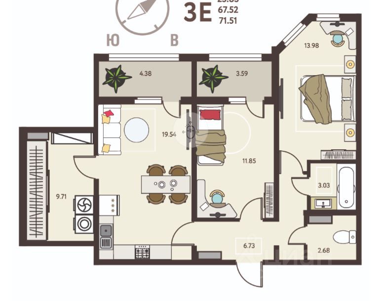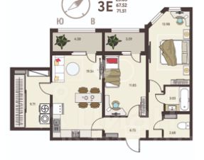 -Кухня-гостиная 19.54 кв.м ,