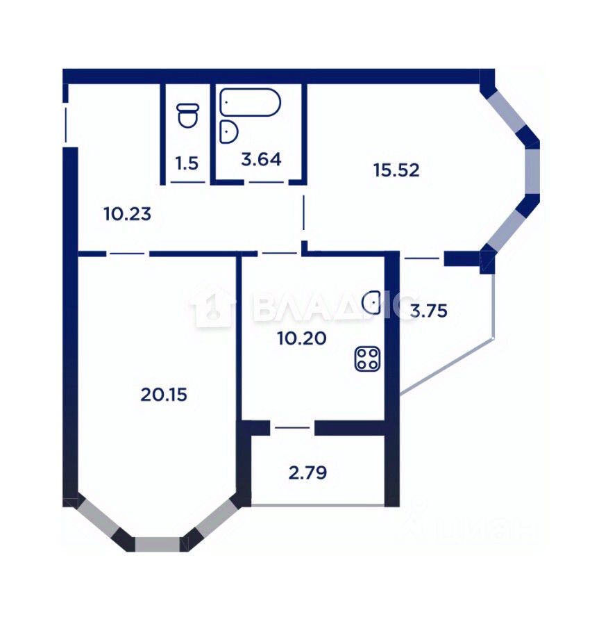 Две просторные комнаты 20,15кв.м и 15,52кв.м (с выходом на лоджию 3,75кв.м), кухня 10,2кв.м (с выходом на вторую лоджию 2,79кв.м), просторный коридор 10,23кв.м и раздельный санузел!