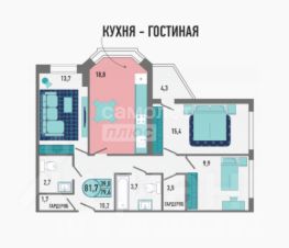 Площадь 81.7 кв.м., кухня гостинная 18.8 кв.м, лоджии 4.3 кв.м, два с/у.