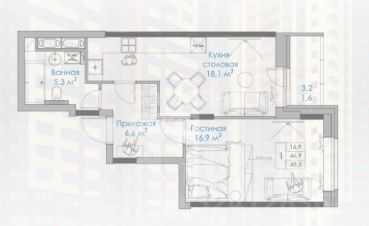 • Жилая площадь: 30.2 м², комнаты 13,3 и 16,9 м²