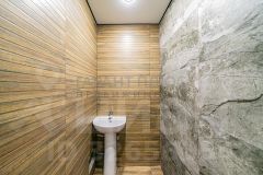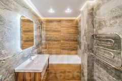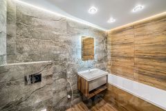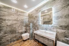 - объединенный санузел в современной отделке керамогранитом и с разными сценариями по освещению.