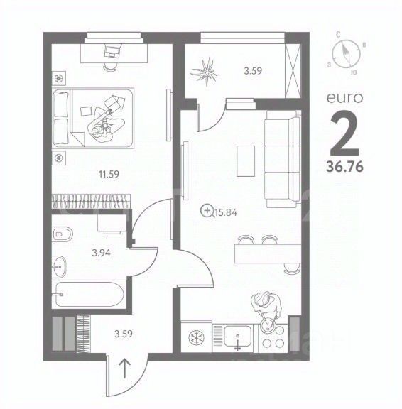 кухня - гостиная 15.84 кв.м., с выходом на лоджию 3.59 кв.м.,