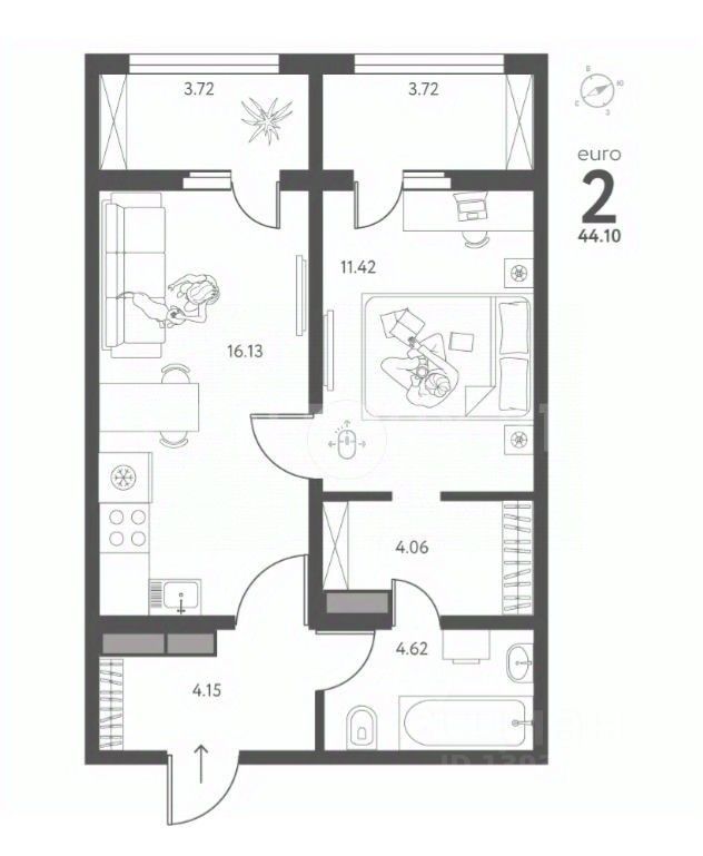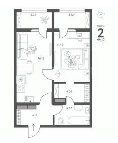 кухня - гостиная 16.13 кв.м., с выходом на лоджию 3.72 кв.м.,