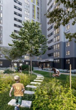 Концепция благоустройства сделана по специальному архитектурному проекту, с малыми архитектурными формами из металла с желтыми цветовыми акцентами, гармонирующими с фасадом домов. Для детской площадки предусмотрены игровые комплексы из натурального дерева в эко-стиле. Предусмотрено продуманное озеленение по дендроплану с автополивом и разноуровневое наружное освещение.