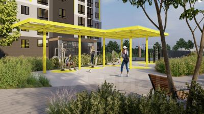 Концепция благоустройства сделана по специальному архитектурному проекту, с малыми архитектурными формами из металла с желтыми цветовыми акцентами, гармонирующими с фасадом домов. Для детской площадки предусмотрены игровые комплексы из натурального дерева в эко-стиле. Предусмотрено продуманное озеленение по дендроплану с автополивом и разноуровневое наружное освещение.