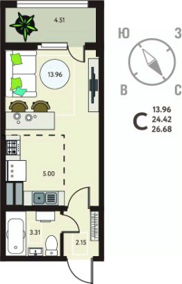 1-комн. квартира-студия в ЖК "ИНСТЕП.МЕХАНИЗАТОРОВ" на 8 этаже. Квартира без отделки, после оформления собственности можно делать ремонт. Общая площадь: 26.68 кв.м., площадь гостиной 13.96 кв.м., из которых 5 кв.м. выделено под кухонную зону. Все окна выходят на одну сторону. В квартире один балкон, один совмещенный санузел. Высота потолков 2.64 м.