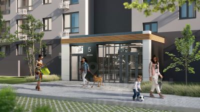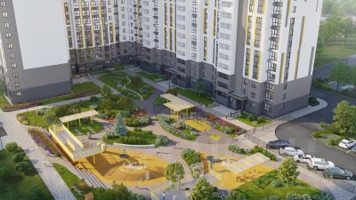 Концепция благоустройства сделана по специальному архитектурному проекту, с малыми архитектурными формами из металла с желтыми цветовыми акцентами, гармонирующими с фасадом домов. Для детской площадки предусмотрены игровые комплексы из натурального дерева в эко-стиле. Предусмотрено продуманное озеленение по дендроплану с автополивом и разноуровневое наружное освещение.