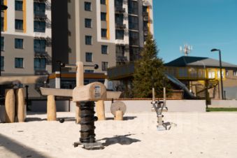Концепция благоустройства сделана по специальному архитектурному проекту, с малыми архитектурными формами из металла с желтыми цветовыми акцентами, гармонирующими с фасадом домов. Для детской площадки предусмотрены игровые комплексы из натурального дерева в эко-стиле. Предусмотрено продуманное озеленение по дендроплану с автополивом и разноуровневое наружное освещение.