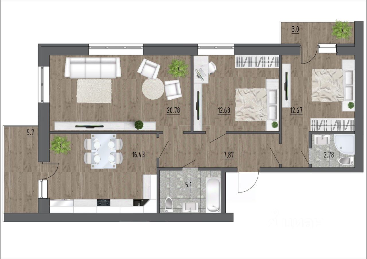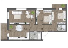 Планировка функциональна: в квартире есть три уютные комнаты, два балкона для отдыха и совмещенный санузел, а также отдельный санузел для удобства всех членов семьи.