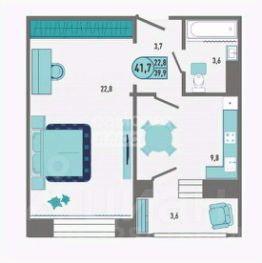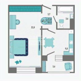 Площадь квартиры 41,7 кв. метров, комната 22,9 кв. метра, кухня 9,8 кв. М.