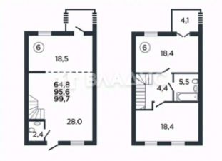 На первом этаже расположена просторная кухня-гостинная с выходом во двор, гостевой санузел. На втором этаже две изолированные спальни и санузел. В одной из спален есть выход на балкон.