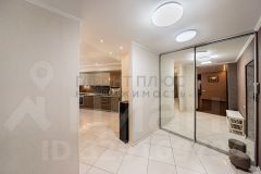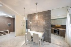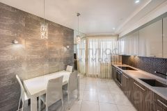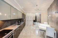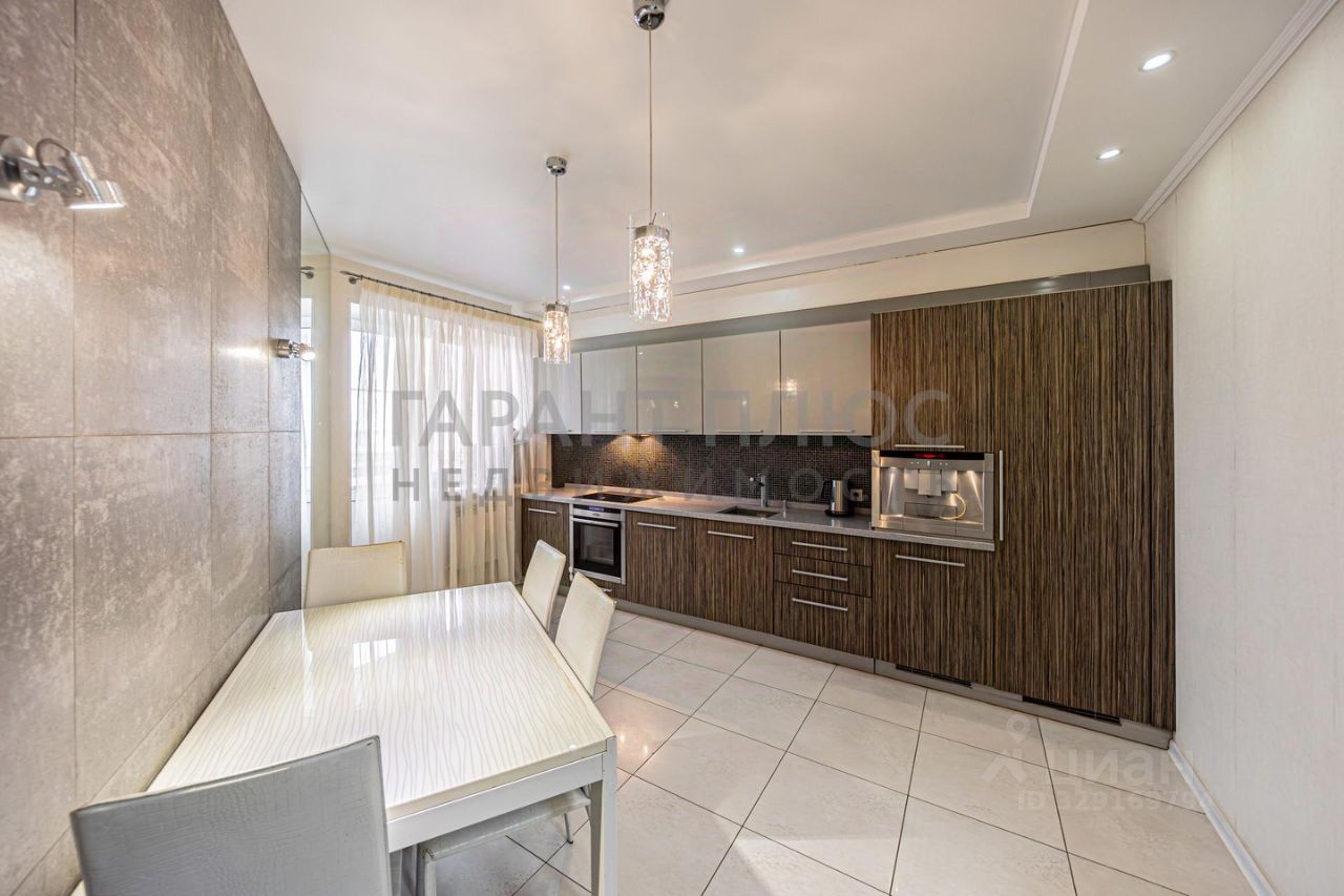 Кухня площадью 15,3 м² полностью оснащена премиальной техникой Neff, включая встроенную кофемашину, варочную панель, посудомоечную машину, холодильник и отдельную морозильную камеру. Из кухни есть выход на застеклённую лоджию с видом в тихий двор.