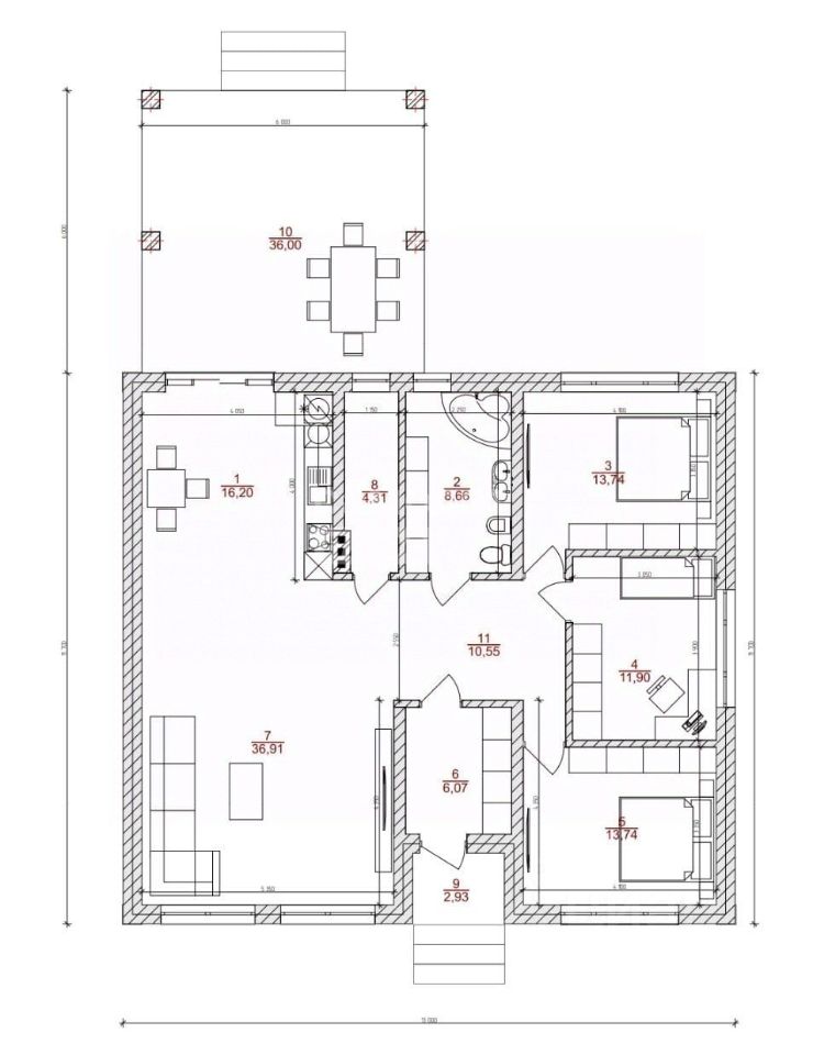 Идеальная планировка дома: кухня-гостиная площадью 52 кв.м , три спальни 13.7+13.7+11.9, санузел площадью 8.66, котельная - 4.31 и веранда -36 кв м.