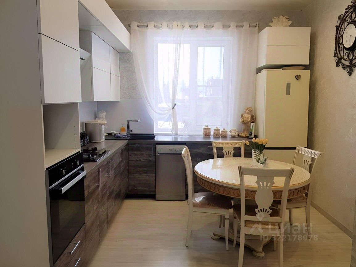 Светлая кухня с обеденным столом и стульями.